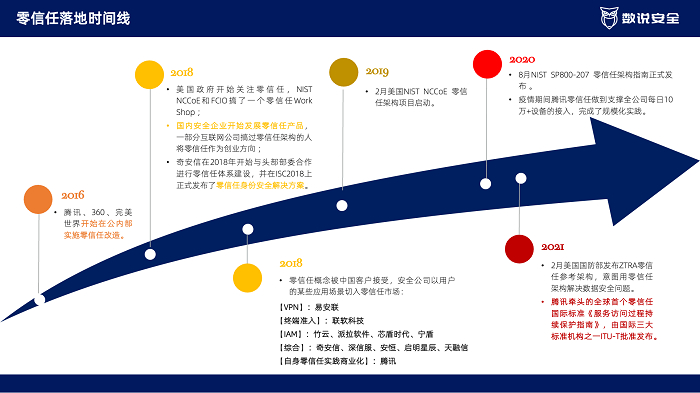 数说安全认为,相比于传统的网络安全公司研发、甲方用户采购使用的一般路径,零信任产品在国内的兴起有所不同,“互联网公司的安全/IT团队自研系统是国内零信任产品的起源,在获得自身的成功应用后,再把系统产品化、推广出去,传统安全公司反而是跟进者,凭借已有的产品或组件,快速补齐零信任产品所需要的模块,利用自己的市场能力进入市场”。而腾讯则是国内第一批尝试零信任实践的厂商之一。