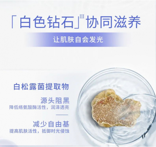 薇安洛青春赋活精华液蕴含珍贵的白松露菌提取物,来自白松露的萃取物,因为稀缺珍贵,具有白色钻石之称,与鱼子酱、鹅肝并列“世界三大珍馐”。薇安洛采用多道科技提取工艺,保留了白松露菌的活性精粹,使其能有效减少自由基及降低络氨酸酶活性。最后,通过阻黑的配方通路来紧实肌肤和改善肌肤暗沉,直击肌肤初老的问题源头,焕亮肌肤光彩。