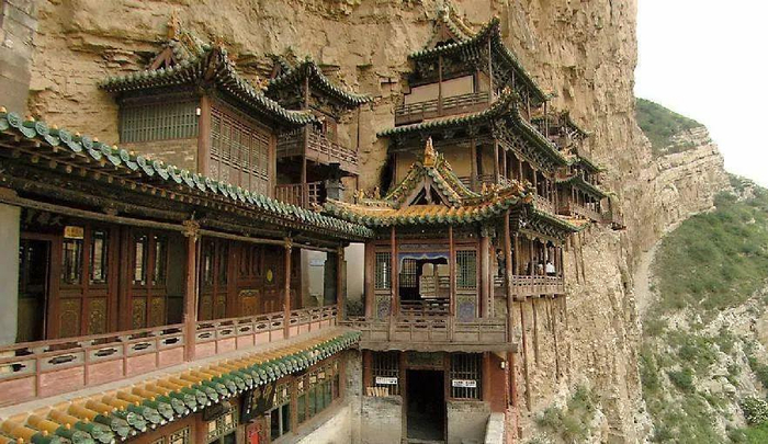 悬空寺坐落在恒山金龙峡西侧翠屏峰峭壁间,建成于公元491年,是佛、道、儒三教合一的独特寺庙。“悬空寺”建筑极具特色,以如临深渊的险峻而著称,素有“悬空寺,半天高,三根马尾空中吊”的俚语,以如临深渊的险峻而著称。