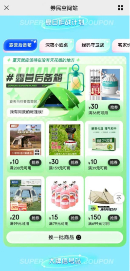 在多元新消费趋势下,消费者的消费动机不再无迹可寻,单一的产品形式购买已成过去式,个性化需求成为主流。例如:在露营、小众运动等场景和生活方式大火的情况下,带动了消费者产生追新、追趋势的消费方式。同时,购物也从单一的大卖场向社交空间转型,“券民空间站”不仅帮助用户省钱,还聚集了丰富的互动、社交玩法,为消费者带来了更多的购物新体验。