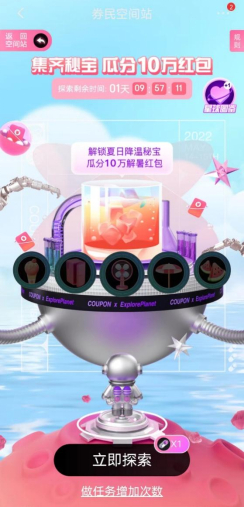 同时,用户进入互动页面还可开启任务探索模式,集齐冰西瓜、冰淇淋、风扇、冰箱、遮阳伞等降温道具,就能完成降温任务,参与消暑红包瓜分。每人每天1次免费探索次数,完成任务可获得更多探索机会。在收集降温道具的过程中,还可能随机掉落各类优惠券。探索时间将于7月21日20:30截止,集齐降温道具的用户可在7月21日21:00开奖,瓜分10万红包。