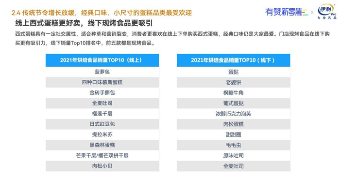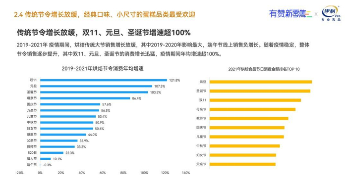 四、传统节令增长放缓,经典口味、小尺寸的蛋糕品类最受欢迎。 2019—2021年间,中秋、端午等增长放缓,其中2019-2020年影响最大,端午节线上销售负增长。双11、元旦、圣诞等节日烘焙食品消费增长迅猛,年均增速超100%,这和近些年新兴节日在年轻群体中越来越受欢迎不无关系。品类选择上,线上西式蛋糕销售更多,线下则是现烤食品更受青睐。