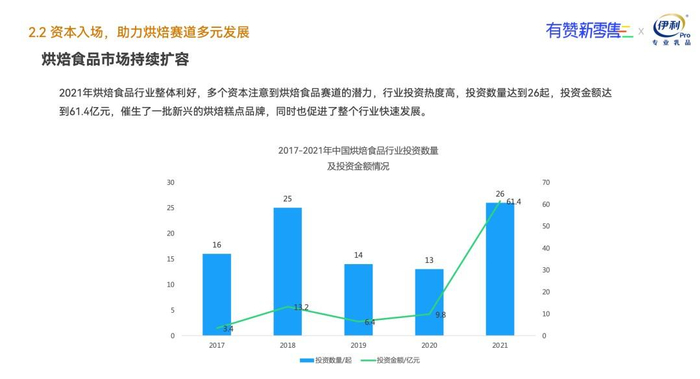 二、资本入场,助力烘焙赛道多元发展。 2021 年,多个资本注意到了烘焙赛道的潜力,投资数量达到 26 起,投资金额达到 61.4 亿元,催生了一批新兴的烘焙糕点品牌,同时也使得整个行业呈现多元化的发展趋势。单一的产品已无法满足消费者的需求,品牌还需从产品外观、制作材料、产品包装、营销方式等方面不断进化,以满足消费者需求。
