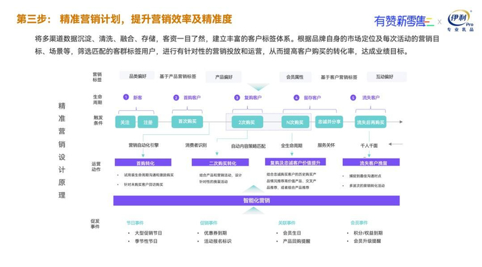 在执行操作方面,首先应将沉默的经营数字唤醒、利用,形成企业有效的客户数据资产;第二步,对用户进行全生命周期洞察,准确了解其喜好;第三步,制定精准的营销计划,以提升营销效率节省营销成本;最后,制定严密的用户培育计划,持续培育孵化,使之产生更多的拉新和复购。