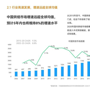 一、行业高速发展,增速远超全球均值。 虽然相较一直将烘焙食品作为早餐及主食的欧美国家,我国的烘焙业起步较晚,且由于生活习惯及饮食方式不同,烘焙食品还未被当作正餐食用,但由于近些年消费者对烘焙食品的认知度不断提升,中国烘焙市场增速迅猛,远超全球均值,预计 5 年内也将维持 8% 的增速水平。