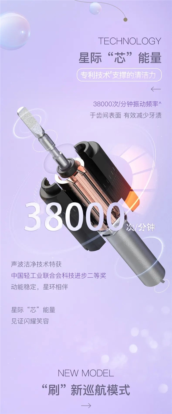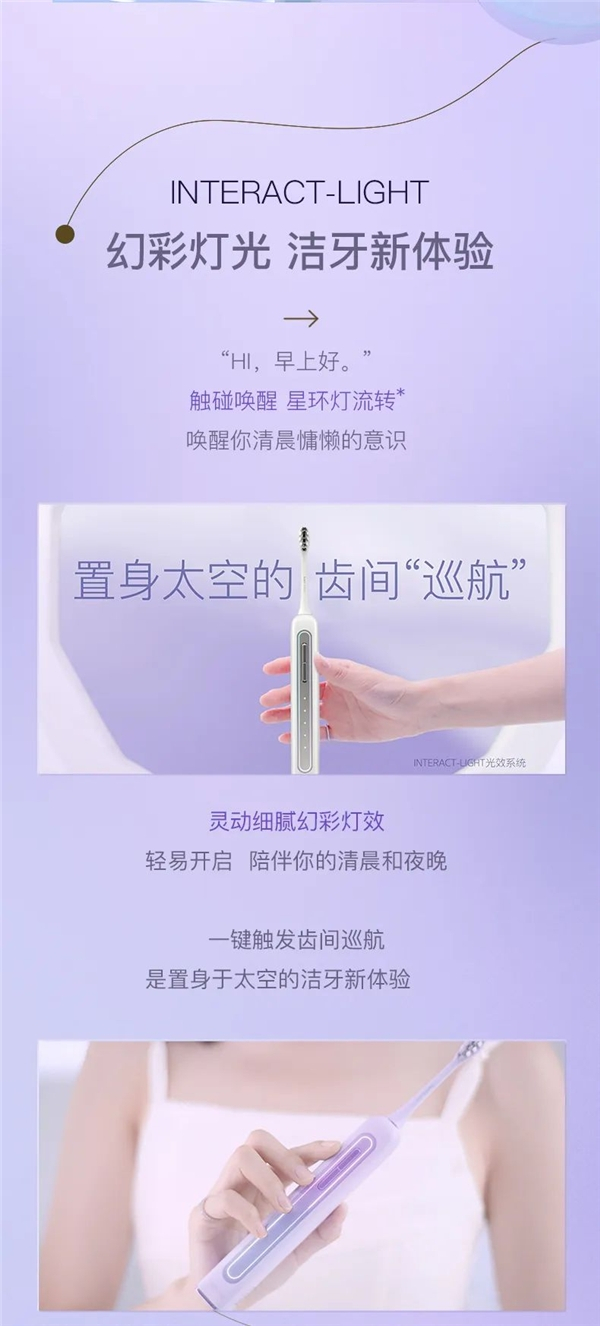 *INTERACT-LIGHT智能光效,指声波电动牙刷采用精密数控透光专利技术1, 通过计算机精密设置及精湛工艺技术,形成0.8mm星环呼吸灯,灯管细腻灵动,360°均匀无断点。
