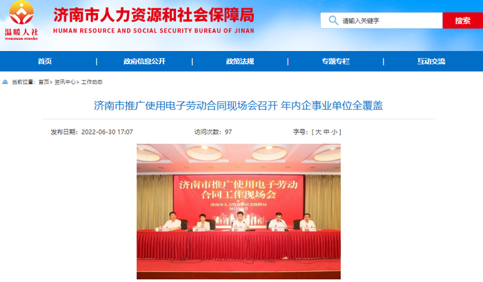 推广使用电子劳动合同是优化营商环境、降低企业成本、维护职工权益的重要举措。现场会上,济南市委组织部副部长、市人力资源社会保障局局长王壮表示:电子劳动合同平台将在全市范围内进行推广使用,2022年电子劳动合同推广使用的目标是实现全市企事业单位全覆盖。