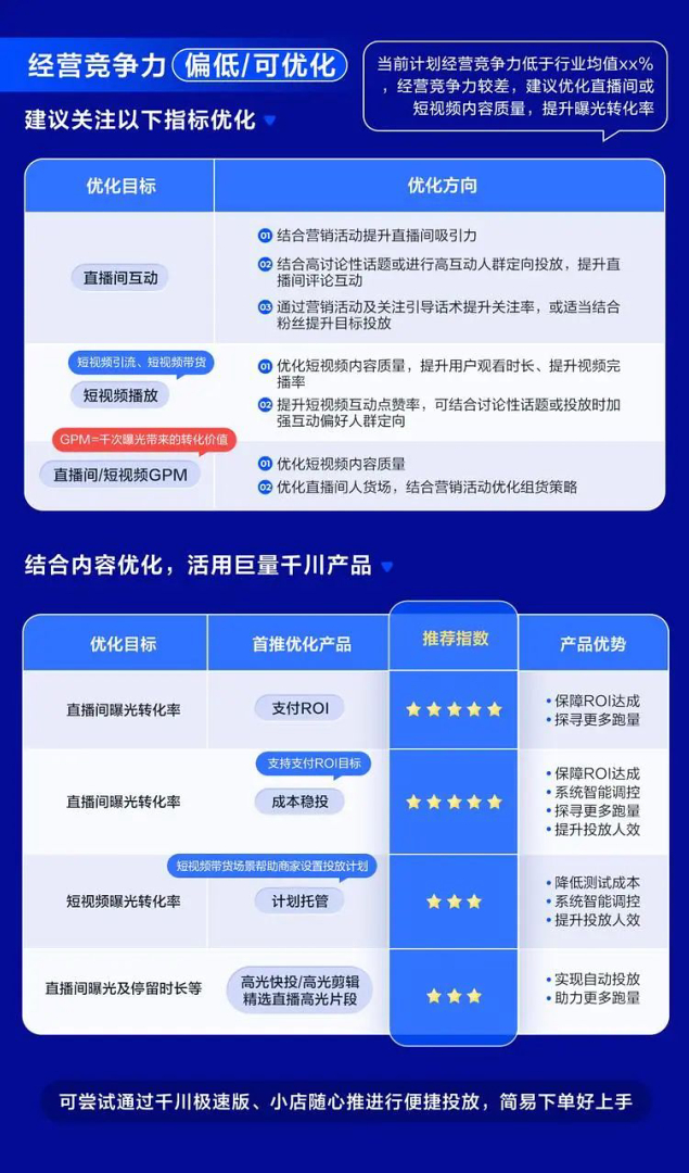 经营竞争力显示「偏低」或「可优化」,可以依托诊断结果,针对性的提升投放GPM和内容互动指标,提升短视频播放、直播间互动等,同时巧用巨量千川产品能力,提升直播间及短视频曝光转化力,提高流量协同效益,提升投放竞争力及投放效果,达成生意可持续增长。