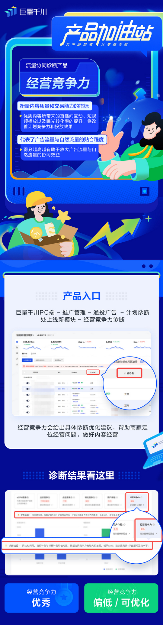 经营竞争力会显示「优质」、「偏低」、「可优化」三种诊断结果帮助商家判断内容经营表现,并同步给出优化建议定位经营问题。