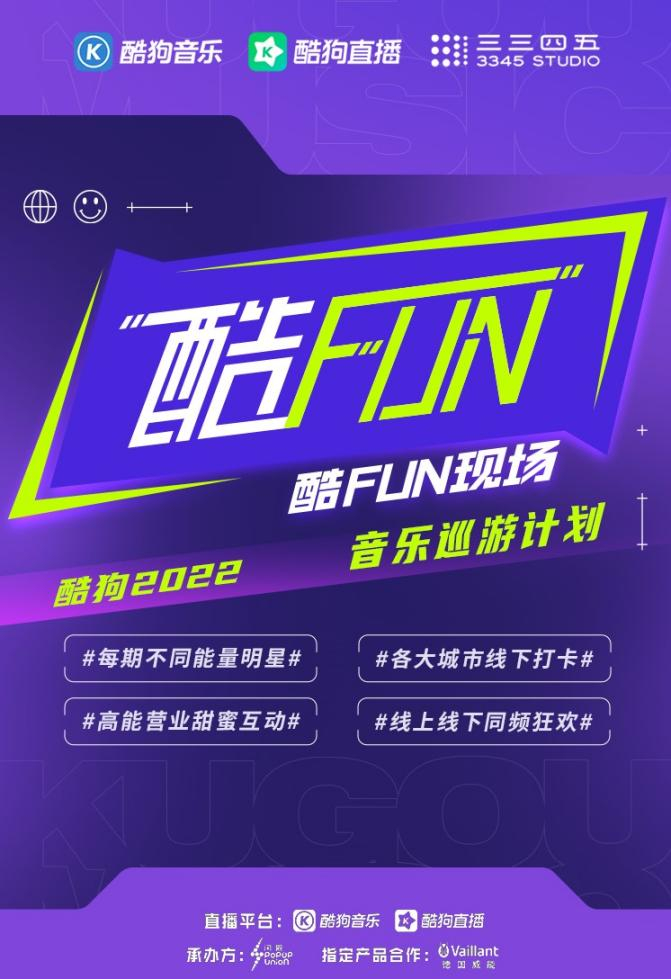酷FUN现场——酷狗2022音乐巡游计划,由酷狗音乐、酷狗直播,以及腾讯音乐娱乐集团三三四五工作室共同举办。作为《酷狗首唱会》全新的线下演出品牌,酷FUN现场围绕“音乐”这一主题,以线下音乐会为载体,打造一次集结红人红歌的“线上+线下”LIVE巡演计划。2022年,“酷FUN现场”计划前往全国各大城市地标、网红打卡点及热门商圈等潮流阵地,全方位打造顶级演唱会现场,以沉浸式的演出和零距离互动体验,拓展粉丝与爱豆之间的多元联动模式,探寻音乐现场的更多可能性。