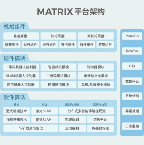 MATRIX,译作“矩阵”,常见于应用数学、计算机、物理等学科,是机器人的AI核心技术支撑。如果把极智嘉机器人产品比作枝叶和果实,那么MATRIX平台就如同树干,就是极智嘉全产品矩阵的发展根基。