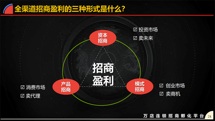 什么叫资本招商活动,就是要不断构建企业的信用体系,行业权威,品牌系统,服务流程,建立企业信任支点,然后再用企业品牌价值溢价的杠杆,用产品招商+模式招商+资本招商相结合的手段最大化的去撬动和整合企业发展所需要的人才、资金和资源。全渠道招商盈利系统的核心,就是要解决企业如何通过公司的产品+模式+股权三者相结合的方式,然后通过全渠道招商的手段最大化的去整合人才、资金、资源,把企业这盘棋做活、把渠道做强做精做透,把市场蛋糕做大。形成品牌护城河。最终实现快速把企业做大做强,符合产业+资本双重属性,企业既赚钱又值钱的经营目标。