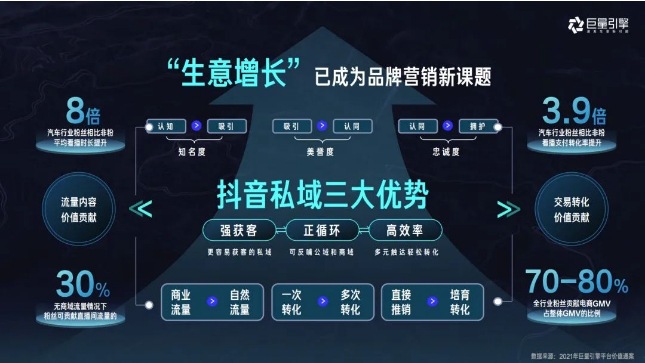 在这样的背景下,企业需要的不只是收获持续的关注度,更是持续有效地获取“高质量客户”。在抖音做好私域经营,成为车企的新着眼点:利用抖音私域,给车企带来品牌曝光与转化增长的双重价值。