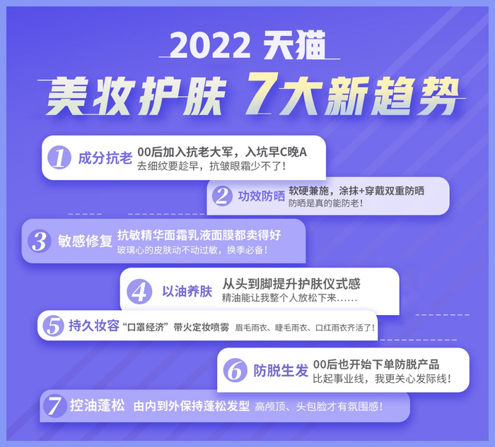 近日,天猫快消联合全球市场研究和咨询公司益普索发布的大快消品类趋势报告显示,成分抗老、功效防晒、敏感修复、持久妆容、以油养肤、防脱生发、控油蓬松成为美妆护肤7大新趋势。这些趋势赛道上新品迭出,更受年轻人欢迎,也驱动品牌持续创新。
