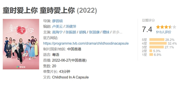 近段时间,TVB爱情轻喜剧《童时爱上你》收获不少关注。该剧由廖晋硕监制,卢美云与汤健萍编审,高海宁、张振朗、陈展鹏等TVB当红小生小花领衔主演,还有胡枫等一众老戏骨实力加盟,演员表现亮眼且剧集质量有保证,开播即取得豆瓣评分7.4的好成绩。