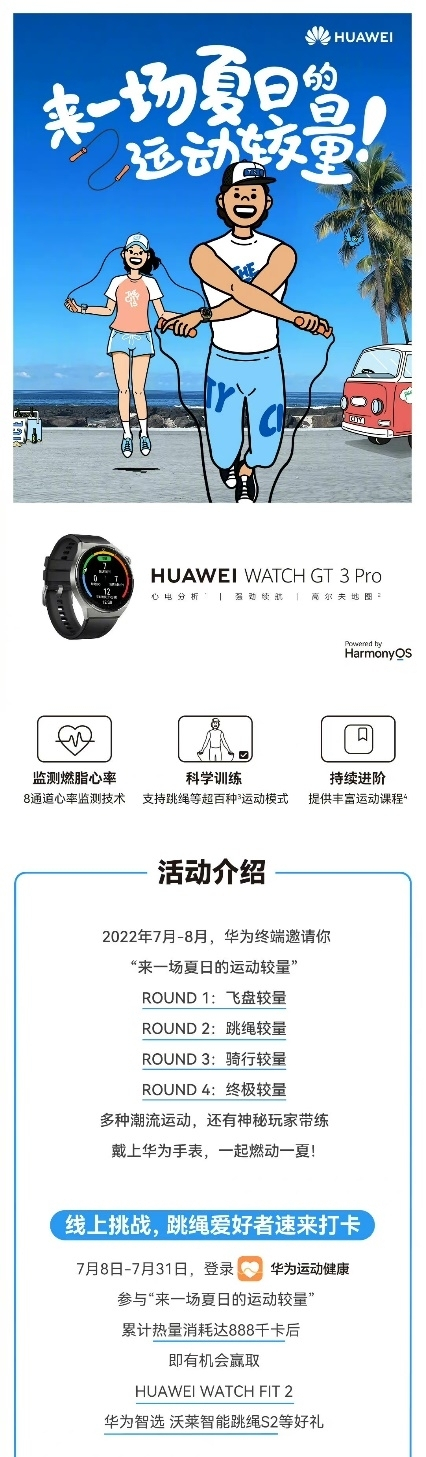 为响应国家全民健身的号召。华为WatchGT 3 Pro联合华为智选沃莱智能跳绳S2推出“来一场夏日的运动较量”活动。活动涵盖飞盘、跳绳、骑行等内容,旨在号召全民健康运动起来!目前,线上活动已在华为运动健康App上线,登录华为运动健康APP参与“来一场的夏日的运动较量”活动累计热量消耗达到888千卡,就有机会赢取精美好礼。目前,线上比赛通道已全面开启,持续时间从7月8日-7月31日。