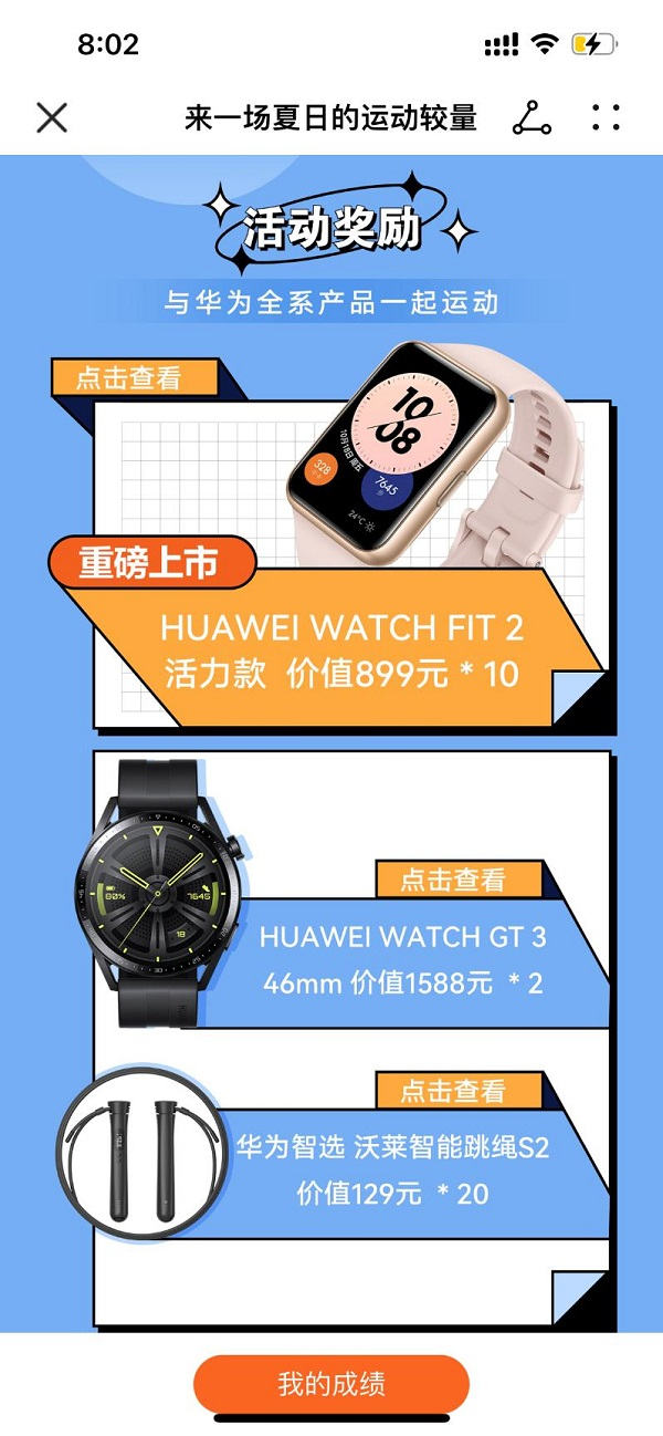 为鼓励用户更加积极的参与此次活动,主办方更是准备了丰厚的奖品,HUAWEI WATCH FIT 2、HUAWEI WATCH GT3与华为智选沃莱智能跳绳S2