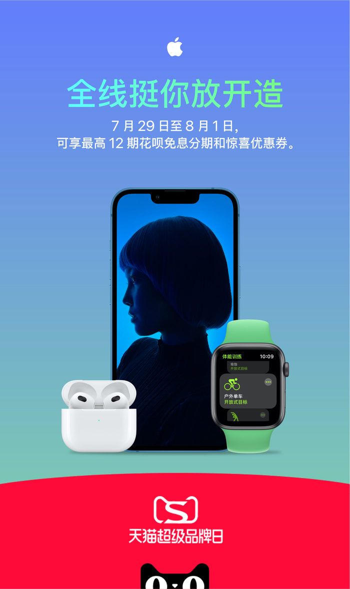 夏天属于欢乐、活力与探索新奇。7 月 29 日至 8 月 1 日,Apple 多线产品首次参与天猫超级品牌日,以“全线挺你放开造”为主题,为消费者带来一场夏日狂欢。