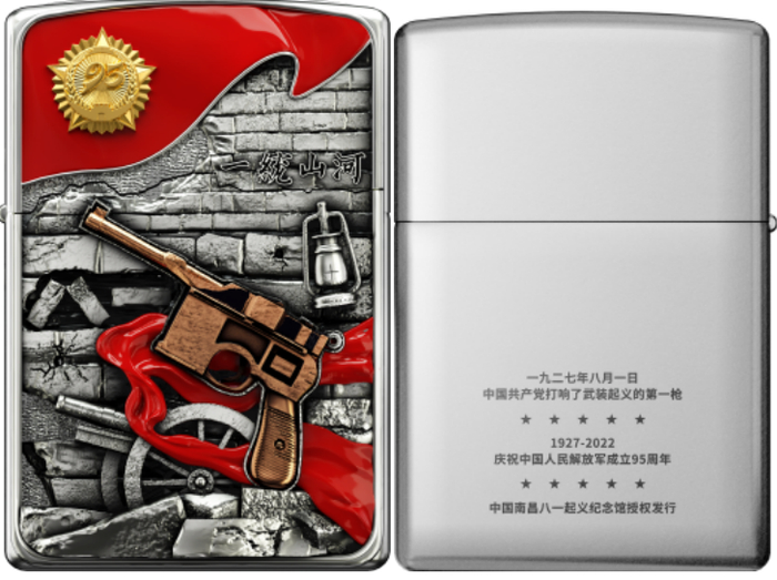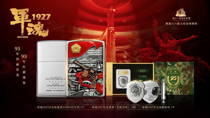 由南昌八一起义馆授权,世界知名打火机品牌zippo定制限量款《军魂》1927纪念火机诞生了。它是一个承载历史纪念意义,用热血铸就军魂,同时也代表着星火燎原,红色精神永传承;我们用打火机、革命第一枪,红领巾、红十字马灯及起义时的口号“河山统一”,以不朽的精神飘动在军旗之下纪念着开天劈地的军魂们,让这种红色精神永流传。