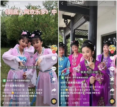 怀宁县黄梅戏剧团在抖音上所引发的关注,也远超过刘丽华的预期。不只直播,剧团发布的黄梅戏短视频也受到网友的欢迎。其中一条《扮皇帝》的视频,点赞量近百万,浏览量上千万。刘丽华认为,“在抖音现场直播,既能让年轻网民更加直观地认识了解安庆优秀的传统文化,也能让黄梅戏这一非物质文化遗产得以更好地传承和发扬光大。”