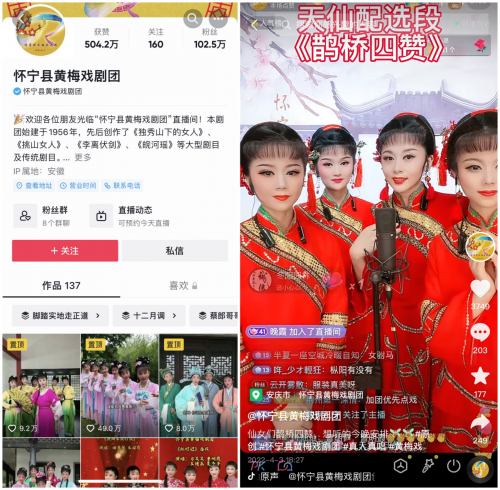 @怀宁县黄梅戏剧团 今年1月在抖音开启了直播。最初,他们只是希望用新的传播方式让剧团“活起来”,没想到半年后,剧团就在抖音收获了上百万粉丝,累计获赞超500万。现在,剧团每晚的直播都有十余万网友在线观看、点赞,送去礼物表达支持。直播打赏让剧团获得了政府拨款和线下演出之外的第三份收入,也坚定了演员们弘扬传统文化的信心。