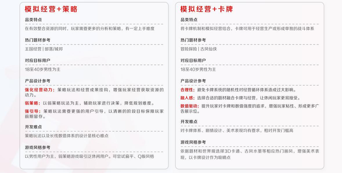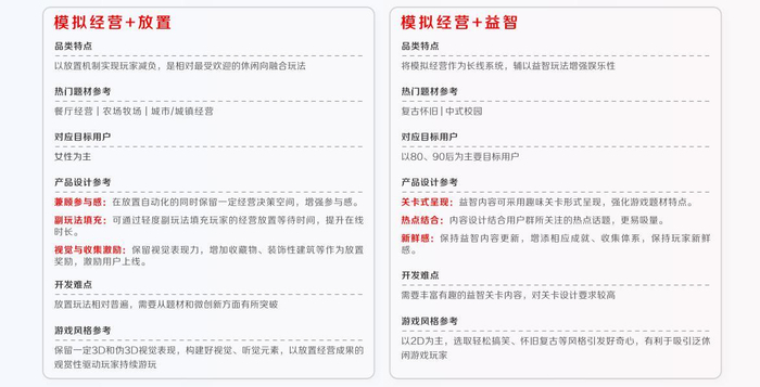 •立项与开发建议:新入局开发团队可以从简化模拟经营和品类融合方向切入,在核心玩法轻度化的同时通过结合副玩法提升用户活跃及留存。根据当前的市场红利和新游表现,放置、益智、策略及卡牌等融合玩法类型值得关注。