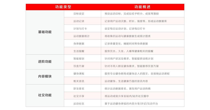 •玩法扫描:运动健身产品按功能类型可分为两大类,一类产品的工具属性更强,主要满足用户各类运动数据的监测、记录需求;另一类在基础功能之上增加更多运动健身的指导内容,服务更为综合。