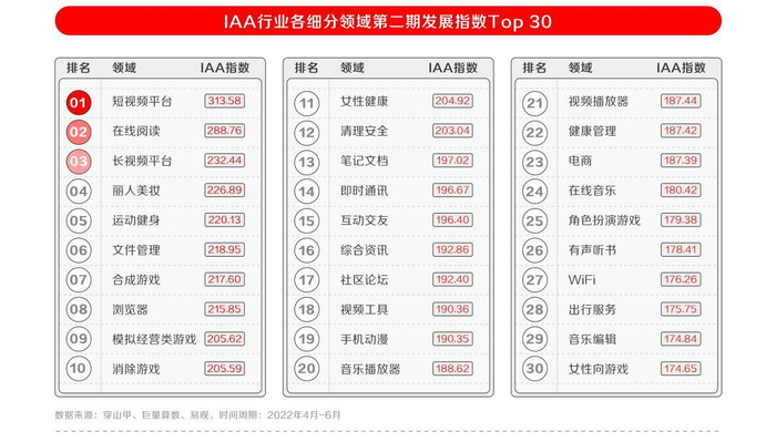 第二期IAA发展指数显示,游戏行业在本季度周期性回落,内容向品类实现排名跃升。