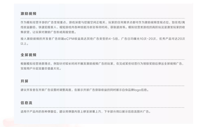模拟经营手游市场上较为通用的广告场景及变现情况如下,开发者可结合游戏玩家使用行为进行广告场景的设置及进一步优化,最大化提升收益空间。