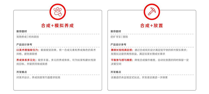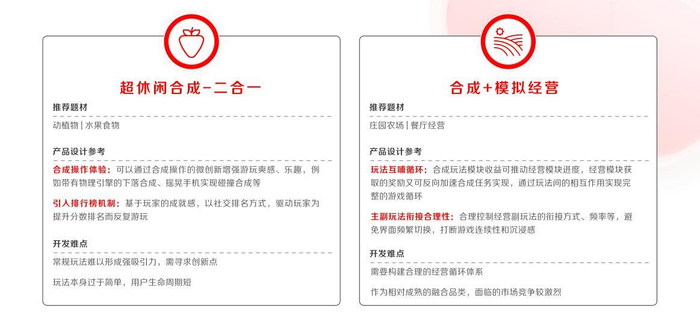 结合开发门槛和品类表现,新进开发者更适合选择超休闲化的简单二合一进行布局;有一定开发经验的团队可以探索轻度的融合合成玩法。