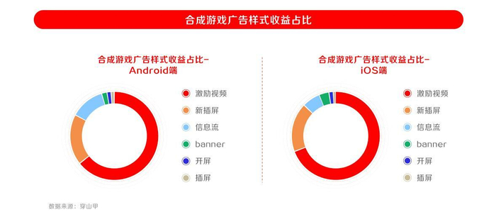 根据穿山甲数据,模拟经营类游戏主要广告样式为激励视频,新插屏次之。iOS端的激励视频收益占比高于Android端。