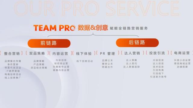 微盟TEAM PRO负责集团整合营销的业务,结合集团强大的CRM、SaaS系统技术,持续赋能全链路整合营销服务,整合集团商城与用户的运营能力与产品,具体而言,前端包含双品策略、内容运营等整合营销业务,后端包含内容&;达人投放、代运营以及线下体验等业务,助力品牌实现品效长期增长。