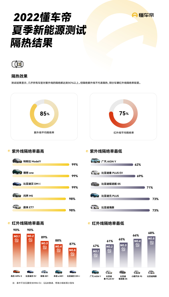 高温天新能源车的防晒能力究竟如何?日前,懂车帝公布2022夏季新能源车测试结果,测试发现,所有带天幕、天窗车型的车顶玻璃紫外线隔绝率均在90%以上,用户无需担心阳光直射会晒伤驾乘人员。但防晒不一定隔热,广汽AION Y、比亚迪秦PLUS EV、小鹏P5等红外线隔绝较差,车内升温较快。