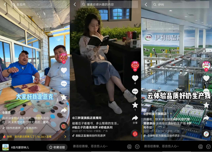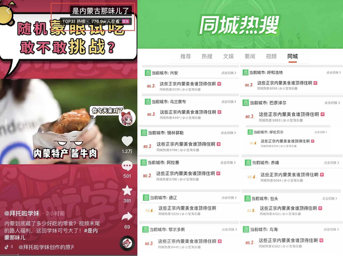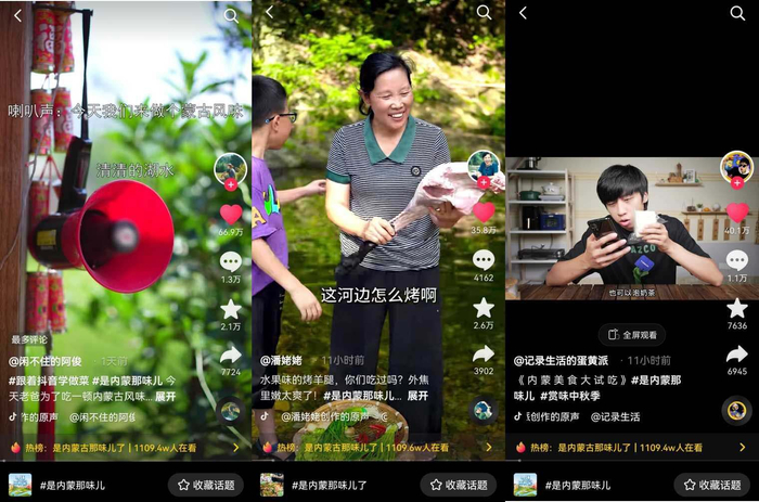 与此同时,抖音上与美食、生活、乡村、地域文化等原产地相关的题材内容,备受网友们关注,可以说原产地优质内容并不缺乏用户兴趣。为提高地域商家的内容创作能力、打通原产地美食的传播和转化路径,活动通过挖掘美食原产地首站“内蒙古”的特色标签和场景,在站内外发起了#是内蒙古那味儿了、#谁都逃不过的内蒙美食#、#路人以为的内蒙能有多离谱#、#这些正宗内蒙美食谁顶得住啊#等丰富话题内容,多个源头美食话题登录抖音、微博热榜,透传内蒙古草原新鲜好味的特色标签,以兴趣内容连接源头好味与用户,激发销售转化。