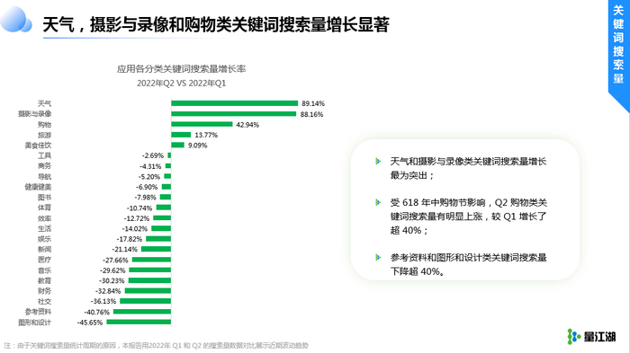 还有一组22年上半年的数据对比,从Q2和Q1的搜索量上看,受疫情影响,更多的人在关注天气、摄影与录像等与居家工作效率有关的App。而电商类,受618的影响,搜索量也有所增长,但不明显。