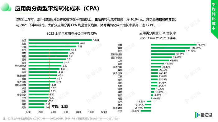 22H1跟21H2相比,应用类中体育、教育、图书类的CPA有了超过100%的增长,这跟疫情发展有很大的关系,疫情封控、居家办公,导致更多的人在家锻炼身体,刘畊宏的大红大紫从侧面印证这点;图形设计和摄影类的增长,也是说明了疫情期间,更多的人居家办公,为了提供效率开始下载设计类app以提供工作效率和成果。