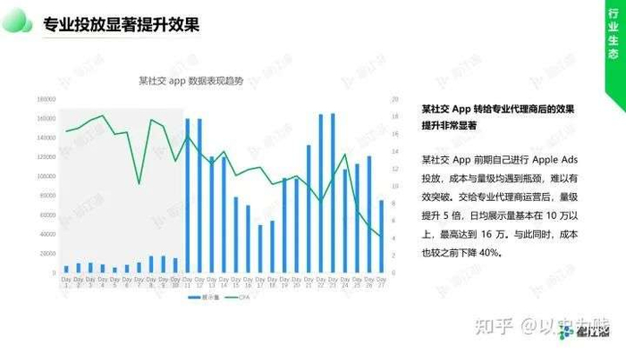 有的客户在投放之后,认为量级不够。事实上,这也经常是认知误区。量江湖有一些客户,客户交付我们投放之后,量级增长了10倍,如下图所示,大喜过望,问我们有什么诀窍,其实大道至简,并非有什么诀窍,而在于专注和专业。过去他们对苹果广告的流量分发机制缺乏认知,对于拓词缺乏手段,局限在苹果提供的百十来个关键词上做文章,而与之相比较专业的服务商则一次性可以挖掘和管理上万的关键词,那么效果自然不一样。