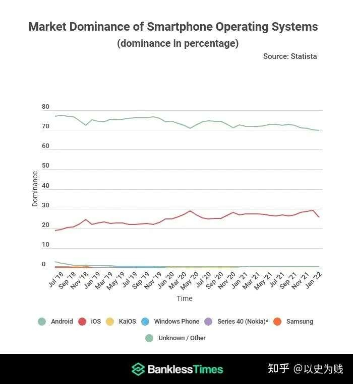 最近,成立于伦敦的财经媒体StockApps发布的统计数据显示:Android在2018年7月还占据了整个移动操作系统77.32%的市场份额,但到了2022年1月,其市场份额就萎缩到69.74%。也就是说在不到四年的时间里,Android就失去了7.58%的全球市场份额。而作为对比,老冤家iOS从2018年7月至2022年1月期间的市场份额,却增长约6%,从此前的19.4%上升至25.49%,按照全球36亿支手机市场存量估算,大约是2.16亿个用户从安卓跳槽到苹果了。
