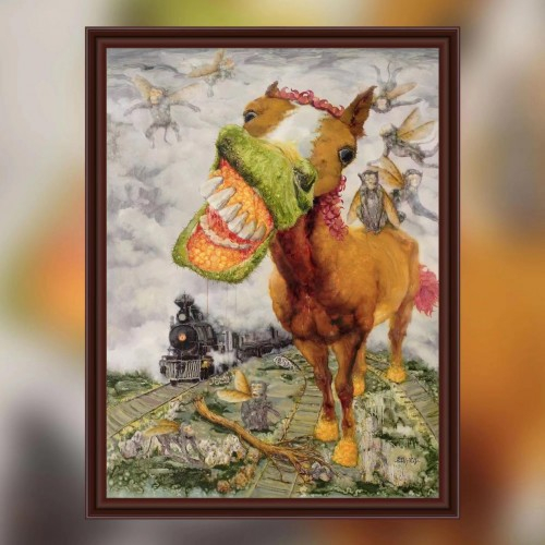 马上封侯——是一个过渡性的作品,邱老师对马缺失的颜色进行夸张处理,把马的嘴张的很大,是邱老师的标志性的画技。大嘴马的雏形借用中国传统的一个典故——马上封侯,马背上带有猴子,是一个非常传统的吉祥题材。同时表现出马的桀骜不驯,猴子的欢快,整个马的造型十分新颖。在马的背景中,艺术家加入蒸汽火车的元素,两者同为旧时代交通工具,均在新时代中失效。作者在作品中有着很多隐喻和暗喻,其中暗示了马的命运和火车的命运不尽相同。在人类文明飞速发展的过程中,科技力量的出现使得传统的马无论在历史上扮演多么重要的角色,它依然逃不出历史的滚滚车轮,岁月的更迭,它将渐渐消失。值得一提的是,马背上的猴子却像精灵一样拥有翅膀,翩翩起舞,充满活力,使得整个画面具有一种荒诞感。这也是邱老师作品当中的一种超现实的,或者是叫做魔幻的画面感。
