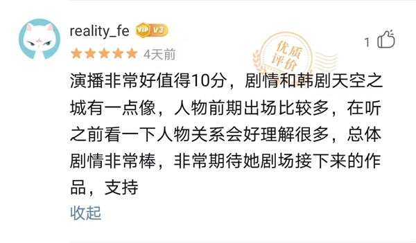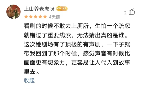 《顶楼》有声剧一经上线即引发听众热议、收听并收获大量好评,有听众表示,声音比画面更有想象力,更容易让人代入到故事中。也有听众对此次推出该剧的喜马拉雅厂牌“她剧场”提出好评,并期待“她剧场”接下来推出的新作。