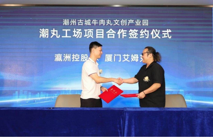 活动现场,广东瀛洲控股集团有限公司与厦门艾姆克斯餐饮管理有限公司签署项目合作协议,合力打造潮州古城牛肉丸文创产业园,促进潮州牛肉丸的品牌建设,融合文化与商业基因,助推潮州经济高质量发展!同时,潮丸工场也在现场进行了战略合作及意向合作的签约仪式。