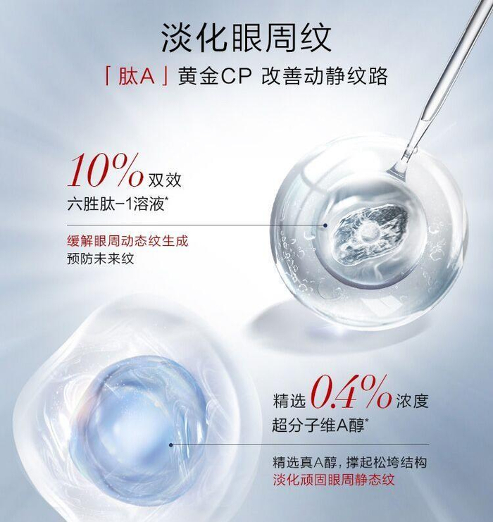 珀莱雅的红宝石冰陀螺眼霜针对人体年龄增长所产生的细纹老化和眼部周围皮肤干燥问题,特添加了抗老组合成分“10% 六胜肽-1”+“0.4%超分子维A醇”。0.4%浓度的超分子维A醇,另外佐以珀莱雅独家专利包裹技术,更好缓解了A醇对于皮肤的刺激性的同时进行眼部抗老;而10%的六胜肽-1专注阻断眼周纹路生成。双效作用淡化动态纹与静态纹,双管齐下效果明显的减少眼部细纹。还添加了0.04%的视黄醇,浓度既有效又温和,更适合于亚洲人娇嫩眼周肌肤。除此之外,珀莱雅红宝石冰陀螺眼霜的配方中添加了Pinoxide成分,有助于促进眼周围循环,360°紧实眼部肌肤,促升胶原蛋白从而紧实眼周。