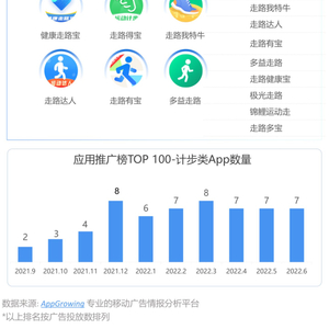 据AppGrowing所追踪到移动应用广告数据,在应用推广排行榜TOP100中,计步类占比近半年来都保持在7-8款,并未呈井喷之势。其中,走路计步、刷视频赚钱是最常见的网赚形式。