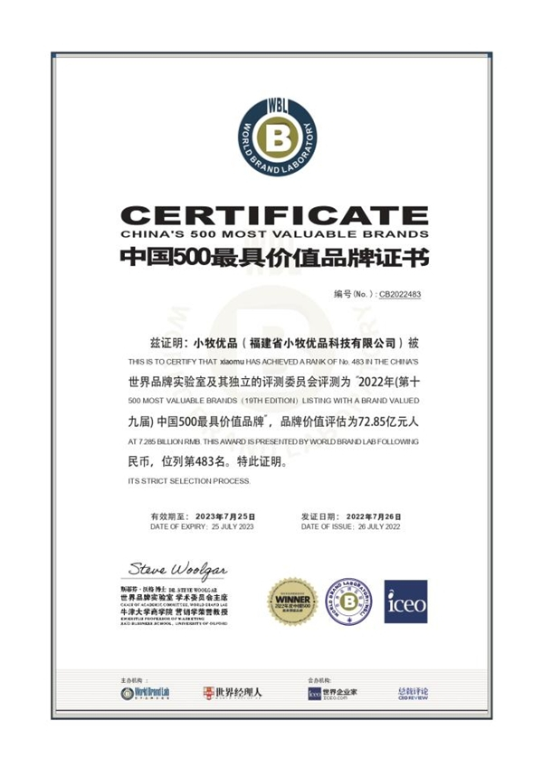 世界品牌实验室连续19年发布的《中国500最具价值品牌》,综合了消费者研究、竞争分析以及对企业未来收入的预测,被誉为中国品牌的”奥斯卡奖“。小牧优品第一次参评就入选”中国500最具价值品牌“,是市场对小牧综合实力和品牌影响力的充分肯定。