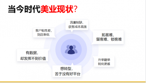 近些年,随着市场经济的发展,线上电商兴起,疫情冲击,美业作为传统线下实体服务业经营越加艰难,流量短缺,门店无客流,获客成本讯涨,门店关店潮愈演愈烈。许多美业老板想迅速走上转型升级之路,走出困境,但在转型升级过程中盲目跟风,没有顾及线下实体经营现状,线上线下难以打通,门店管理经营混乱,拓客渠道单一、用户管理体系缺失。