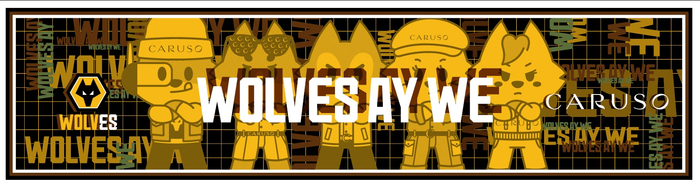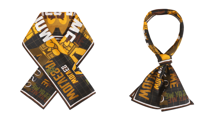 此次推出的限量联名丝巾,以100%桑蚕丝制成,并采用业内首创的双面荧光印花,丝巾在特定黑暗的环境中将会展现独特视觉效果。90*22.5厘米定制尺幅的长形方巾,使其不但能为日常穿着带来优雅风尚,更能轻松转换成为应援手幅,为狼队电竞的赛事助威。丝巾设计图案以狼队的吉祥物“傲伍”为灵感,五只小狼皆换以Caruso绅装形象,酷帅雅趣;‘WOLVES AY WE’的狼队俱乐部口号则让其应援属性加满。黄黑配色以及赛博朋克的设计风格让这款丝巾更加现代摩登,而手工卷边则让丝巾的奢雅感倍增。