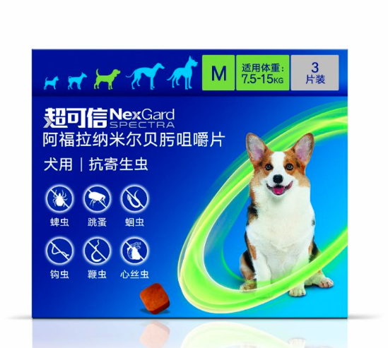 超可信是一款口服的内外同驱的驱虫药,每月服用一次,就能驱除蜱虫、跳蚤、蛔虫、钩虫、鞭虫这些体内外的寄生虫,还能预防蚊虫传播的心丝虫。除此之外,针对狗狗吃药难这个问题,超可信设计成了经典的牛肉风味咀嚼片,狗狗不会察觉到其中的药物味道,对进食产生抗拒。