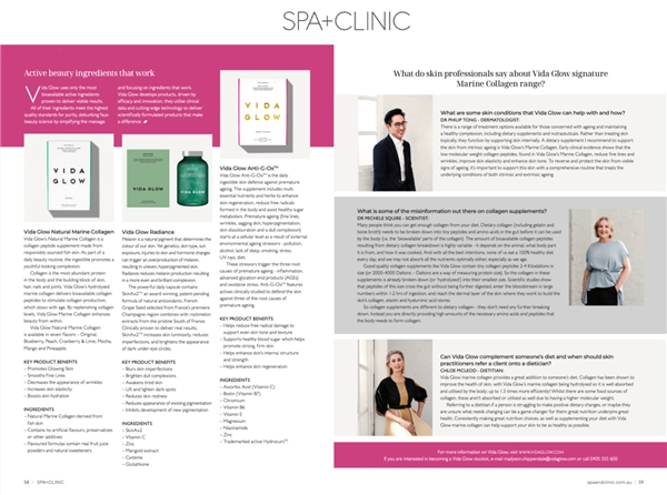 澳洲医美行业权威杂志Spa+Clinic也曾刊出Vida Glow专题报道,从皮肤专家的角度深入分析Vida Glow三大明星产品:海洋胶原蛋白、滤镜胶囊和抗糖抗氧闪释粉的科学方案,对它们的创新科技口服美容功效给予高度肯定。