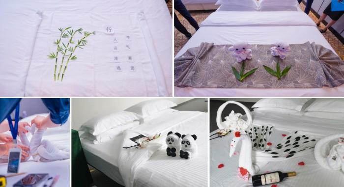 增值服务竞赛环节主要展示酒店为客人提供的各类增值服务,包括奉茶、夜床服务、花式毛巾折叠等。在选手们的巧手下,白色的毛巾“幻化”成软萌可爱的大熊猫、孔雀、天鹅、鸳鸯、小象……更有员工用竹叶和毛巾作出一幅优雅画卷。