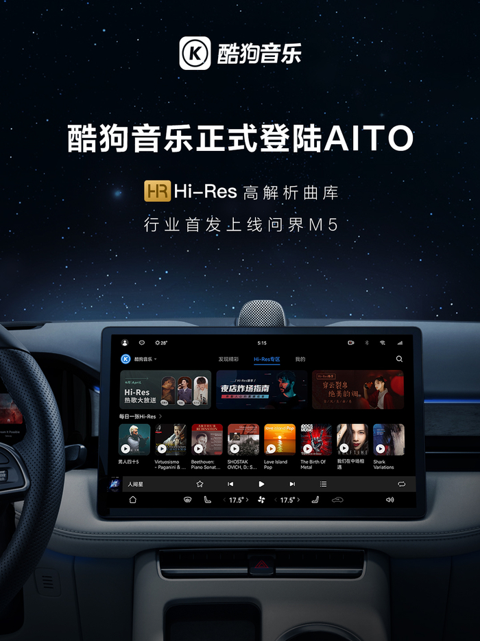 今年,酷狗音乐还在车载行业内首次推出在线Hi-Res级音频,并正式上线AITO问界M5,推动了车载音乐体验一次跨越式的提升,让车载音乐进入高解析时代。